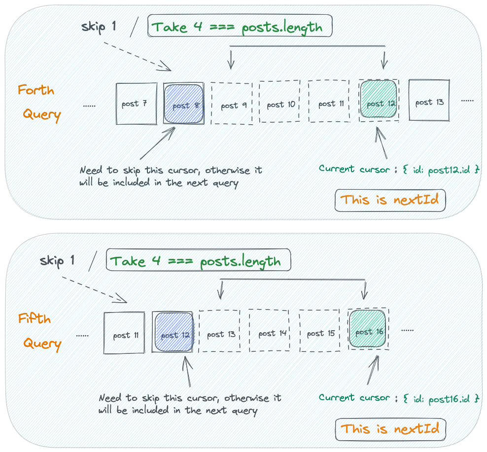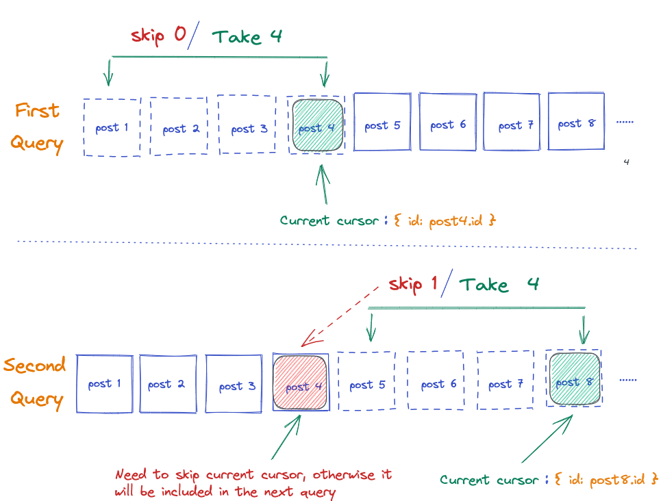 There are two types of pagination in Prisma: offset pagination and cursor-based pagination. In order to make React Query work, we will use the latter. You can check the details of what are the differences between these two in the doc. I have to admit the first time when I read the documentation I was still muddled. If you are too, I've created some illustrations of how it works.